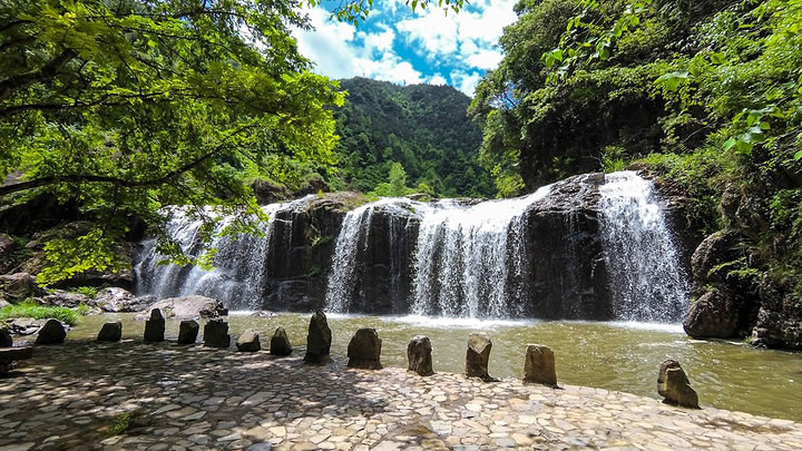 - 核心特色:以峽谷漂流為核心,融合自然奇觀(石林飛瀑、三仙巖、萬(wàn)年古河床)、生態(tài)探險(xiǎn)(高空溜索、飛躍山澗)及非遺文化(土著宴、刀山火海表演)。2022年新增漂流拓展區(qū)、浮橋等設(shè)施,被譽(yù)為“浙江第一漂流”。