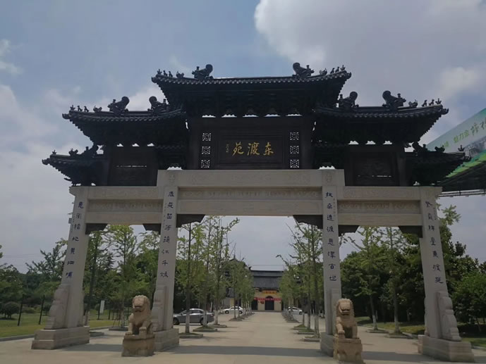 東渡苑景區(qū)位于江蘇省蘇州市張家港市塘橋鎮(zhèn),地處204國道與338省道交匯處,占地面積95300 m²。該地為公元753年唐代高僧鑒真第六次東渡日本成功的啟航地,古稱黃泗浦。據(jù)《沙洲縣志》記載:"唐高僧鑒真東渡日本連續(xù)五次失敗后,第六次于黃泗浦口啟航東渡成功。"1963年設(shè)立石質(zhì)經(jīng)幢作為紀(jì)念。景區(qū)包含鑒真東渡紀(jì)念館、東渡寺、碑亭等仿唐建筑群,其中主館供奉高2.06米的鑒真銅像,壁畫展現(xiàn)其第六次東渡歷程,后方木刻書屏節(jié)選《東征傳》記載第六次東渡細(xì)節(jié)。遺址區(qū)發(fā)現(xiàn)唐代河道、寺院類建筑遺存及石佛雕像,出土長沙窯執(zhí)壺等外銷瓷器和宋代銘文磚,2013年列為全國重點文物保護(hù)單位,2018年入選全國十大考古新發(fā)現(xiàn)。景區(qū)現(xiàn)存東渡橋橫跨黃泗浦兩岸,橋側(cè)碑亭刻有阿倍仲麻呂詩作及郭沫若題詩,種植雪松、桂花等50余種植物構(gòu)成江南水鄉(xiāng)景觀。