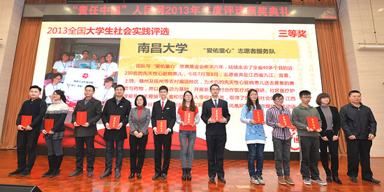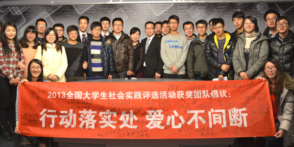 人民網(wǎng)北京1月15日電 (記者 張葳)1月15日,2013全國大學(xué)生社會實(shí)踐評選活動舉行頒獎和座談活動,獲獎大學(xué)生代表上百個團(tuán)隊發(fā)表了倡議書,號召全國大學(xué)生們在社會實(shí)踐中做到“行動落實(shí)處,愛心不間斷”,經(jīng)常性、持續(xù)性地走進(jìn)社會、服務(wù)基層,拒絕形式主義。