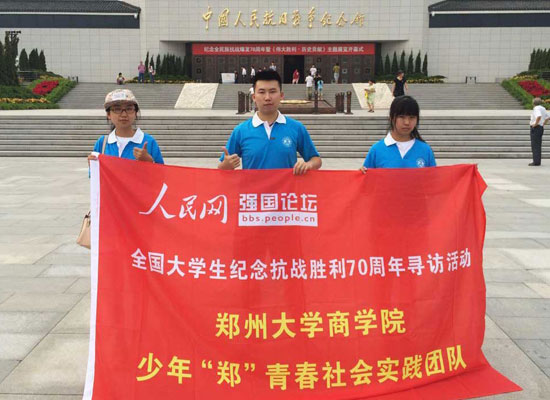7月16日,鄭州大學(xué)“少年鄭青春”暑期實踐隊,開展了“緬懷革命先烈,樹立信心實現(xiàn)中國夢”實踐活動。團隊通過抗戰(zhàn)知識調(diào)研、參觀抗戰(zhàn)紀念館、采訪抗戰(zhàn)老兵、向幼兒園孩子普及抗戰(zhàn)知識等方式紀念抗戰(zhàn)勝利70周年。