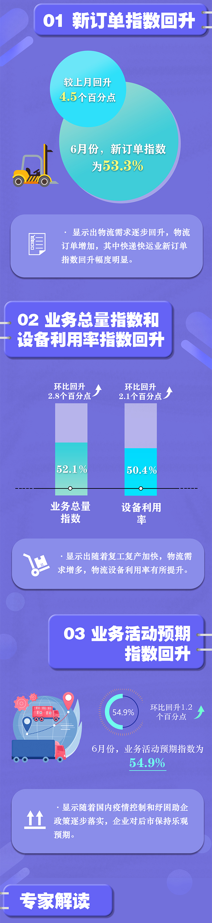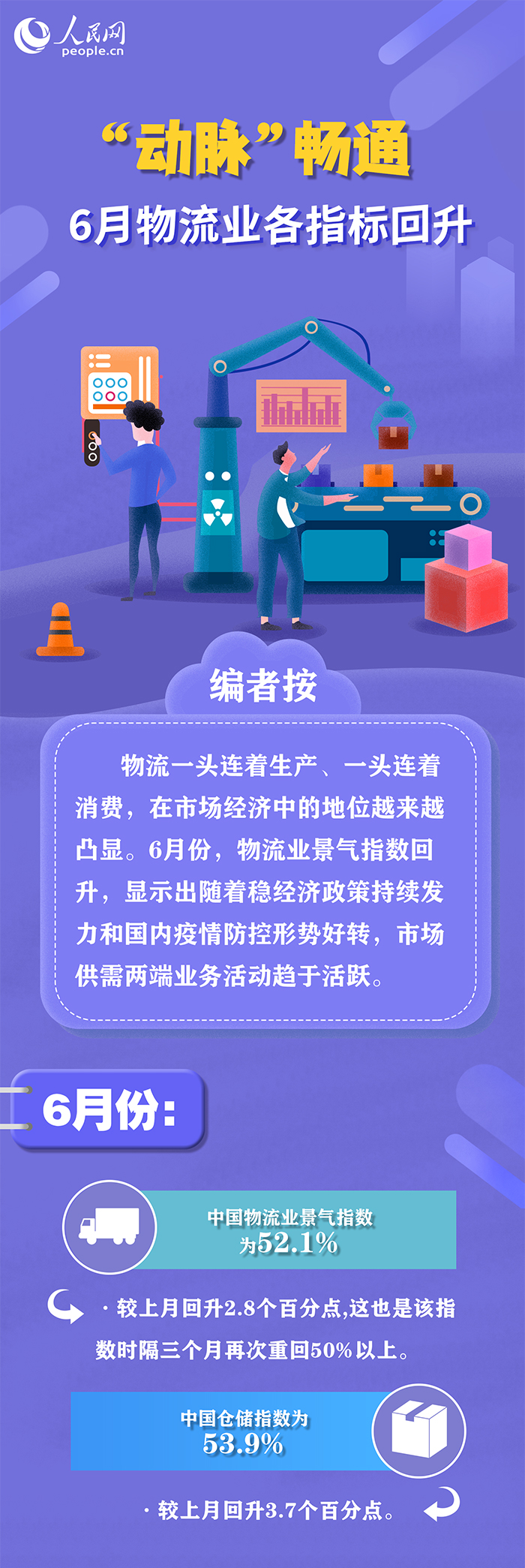 物流被稱作是國民經(jīng)濟的“晴雨表”。中國物流與采購聯(lián)合會會長助理、高級經(jīng)濟師何輝在接受人民網(wǎng)“強觀察”欄目記者采訪時表示,從物流業(yè)景氣指數(shù)等數(shù)據(jù)看,隨著國內(nèi)疫情防控形勢好轉(zhuǎn)和穩(wěn)經(jīng)濟系列政策持續(xù)發(fā)力,6月份國內(nèi)市場供應(yīng)鏈上下游業(yè)務(wù)活動進一步恢復(fù),并逐步趨于活躍。