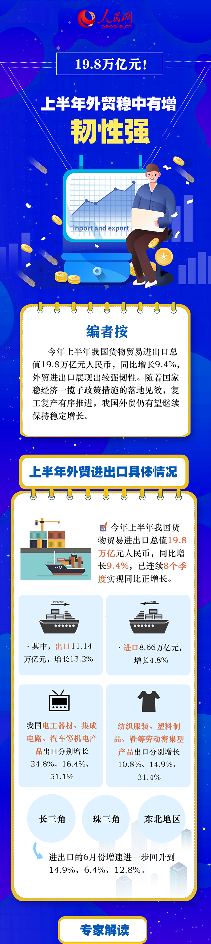上半年我國(guó)外貿(mào)進(jìn)出口展現(xiàn)出較強(qiáng)的韌性,一季度平穩(wěn)開(kāi)局,5、6月份迅速扭轉(zhuǎn)了4月份增速下滑的趨勢(shì),為全年外貿(mào)保穩(wěn)提質(zhì)打下了堅(jiān)實(shí)的基礎(chǔ)。據(jù)海關(guān)統(tǒng)計(jì),今年上半年我國(guó)貨物貿(mào)易進(jìn)出口總值19.8萬(wàn)億元人民幣,同比增長(zhǎng)9.4%。其中,出口11.14萬(wàn)億元,增長(zhǎng)13.2%;進(jìn)口8.66萬(wàn)億元,增長(zhǎng)4.8%。