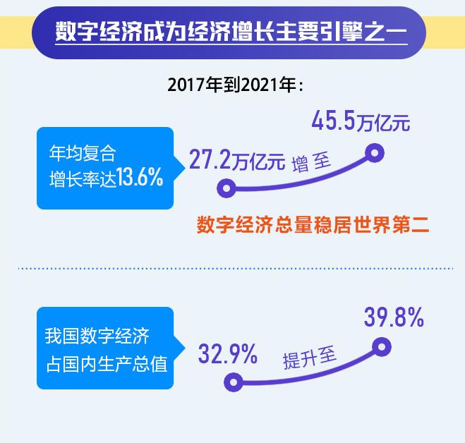 《報告》顯示,2017年到2021年,我國數(shù)字經(jīng)濟規(guī)模從27.2萬億增至45.5萬億元,總量穩(wěn)居世界第二,年均復合增長率達13.6%,占國內(nèi)生產(chǎn)總值比重從32.9%提升至39.8%,成為推動經(jīng)濟增長的主要引擎之一。