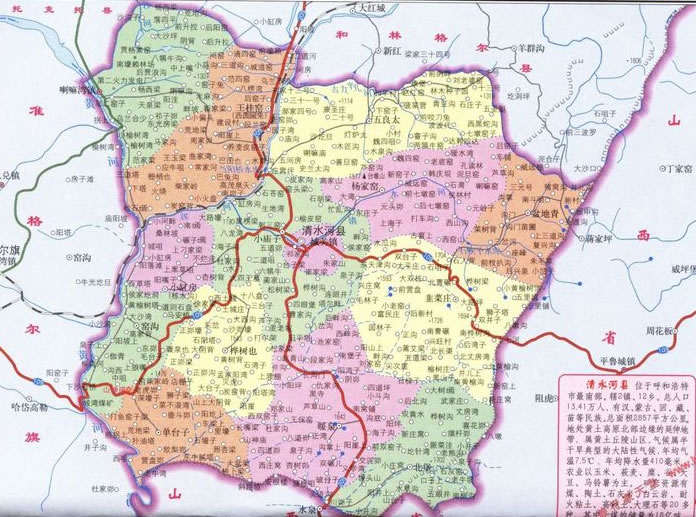 清水河縣因境內(nèi)有清水河而得名。位于內(nèi)蒙古自治區(qū)中部,呼和浩特市最南端。東南與山西省平魯縣、偏關(guān)縣為鄰,西隔黃河與伊克昭盟準(zhǔn)格爾旗相望,北連和林格爾縣、托克托縣。面積2859平方公里。