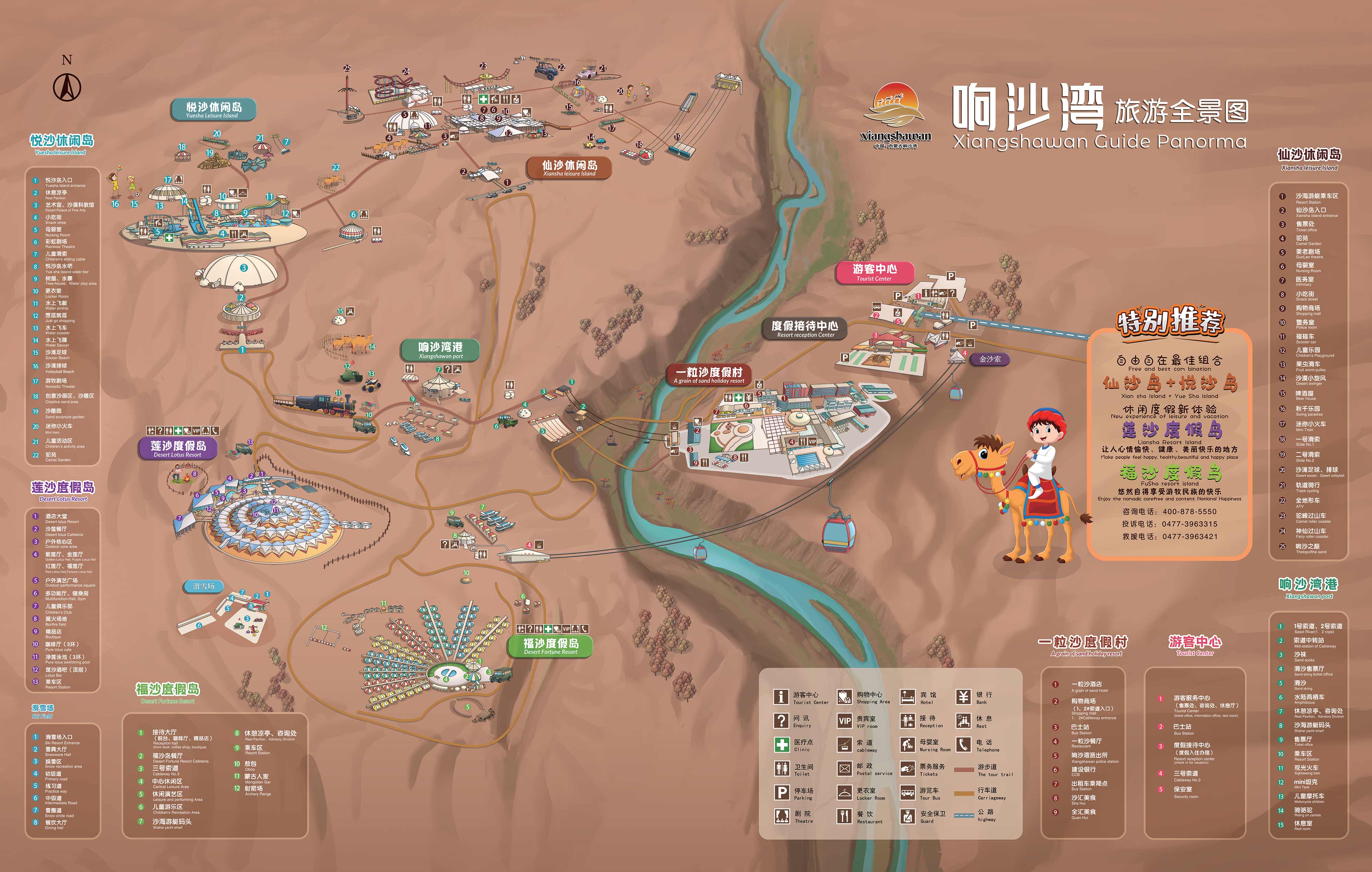 基于獨(dú)特的地形地貌及地理位置,響沙灣發(fā)展為集觀光與休閑度假為一體的特大綜合型沙漠休閑度假景區(qū),包含蓮沙度假島、福沙度假島、一粒沙度假村、悅沙休閑島、仙沙休閑島五個(gè)區(qū)域。