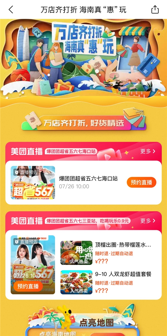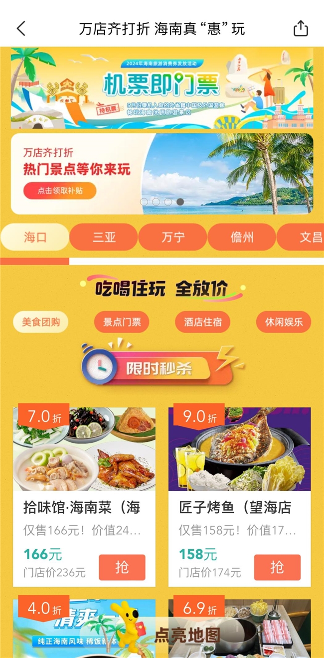 “萬(wàn)店齊打折 海南真惠玩”主題營(yíng)銷活動(dòng)由海南省旅游和文化廣電體育廳和美團(tuán)聯(lián)合發(fā)起,活動(dòng)覆蓋了海南省內(nèi)十八個(gè)城市,全品類商家紛紛參與,為游客們帶來(lái)了前所未有的優(yōu)惠和福利。活動(dòng)期間海南省旅文廳聯(lián)合美團(tuán)攜手一萬(wàn)家商戶,為廣大消費(fèi)者和游客提供了不低于1000萬(wàn)遠(yuǎn)的補(bǔ)貼折扣,用戶只要在美團(tuán)App、大眾點(diǎn)評(píng)App搜索“萬(wàn)店齊打折”等字樣,即可進(jìn)入專題頁(yè),參與各類福利活動(dòng)。