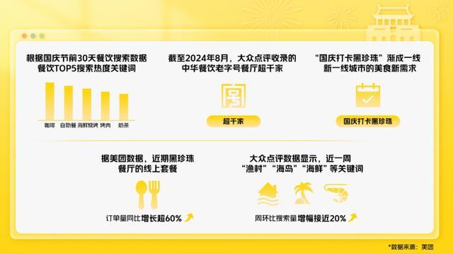 “國慶打卡黑珍珠”漸成一線、新一線城市的美食新需求。據(jù)美團數(shù)據(jù)顯示,近期黑珍珠餐廳的線上套餐訂單量同比增長超60%,深圳、福州、廣州地區(qū)提前一周預(yù)訂國慶假期黑珍珠餐廳座位的訂單量同比去年增長均超過2倍,南京、無錫增幅緊隨其后。數(shù)據(jù)顯示,20-30歲的消費者旅行時更喜歡打卡美食市集,為此一些城市還聯(lián)合平臺線上線下打造美食市集等消費新業(yè)態(tài)。