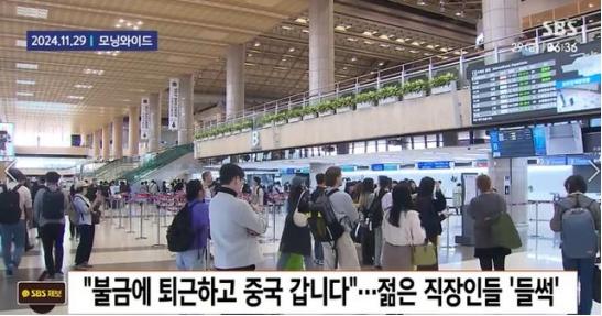 韓國(guó)機(jī)場(chǎng)排起長(zhǎng)隊(duì)(韓國(guó)SBS電視臺(tái)報(bào)道截圖)
