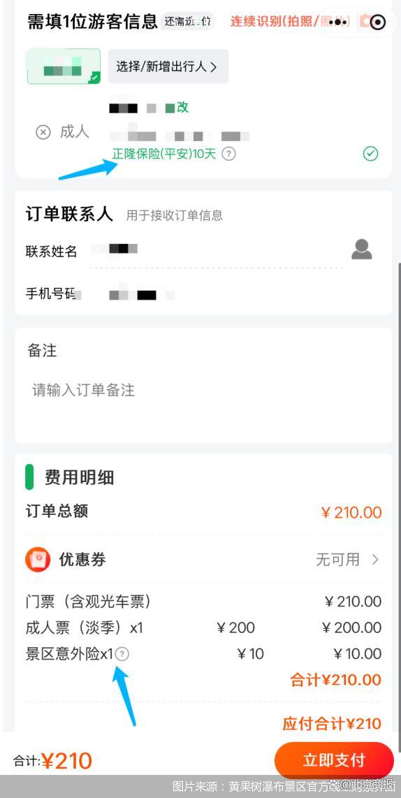 比如,游客在黃果樹瀑布景區(qū)官方線上渠道購票時,在提交訂單界面,會捆綁有一份“景區(qū)意外險”,顯示為10元。當(dāng)記者填寫完身份信息后,在身份信息旁會出現(xiàn)“正隆保險(平安)10天”字樣,并且進行了默認勾選,如果不需要購買保險,則需要取消該選項的勾選。