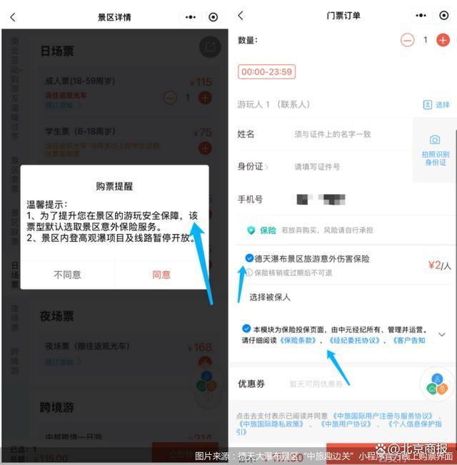 廣西德天大瀑布景區(qū)的官方線上購票渠道在選擇“日場票”(成人票)后,會提示“為了提升您在景區(qū)的游玩安全保障,該票型默認選取景區(qū)意外保險服務(wù)”。進一步來看,該景區(qū)默認勾選的保險為“德天瀑布景區(qū)旅游意外傷害保險”,并在保險名稱下方標(biāo)有“本模塊為保險投保界面,由中元經(jīng)紀所有、管理并運營”。