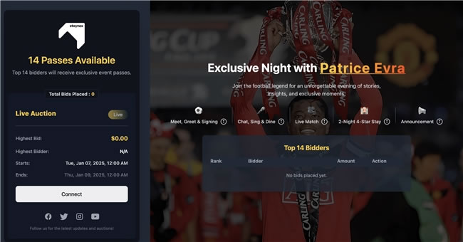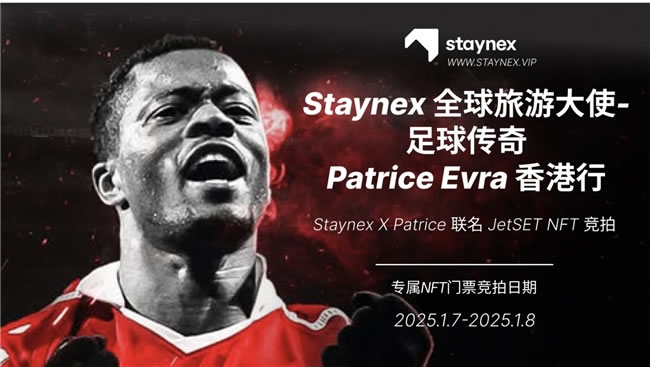 此外,活動(dòng)現(xiàn)場(chǎng)將見證 STAYNEX 與 Patrice Evra 的簽約儀式,并獲取精美禮品、幸運(yùn)抽獎(jiǎng)和獨(dú)家優(yōu)惠。具體相關(guān)權(quán)益或競(jìng)拍鏈接以及競(jìng)拍教程請(qǐng)查看STAYNEX.VIP 官方說明。