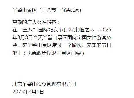 2025年3月8日當天丫髻山景區(qū)面向全國女性游客免票(優(yōu)惠政策僅限于景區(qū)門票)