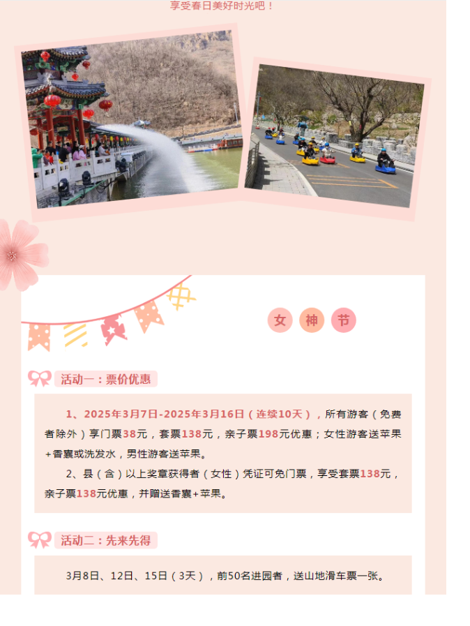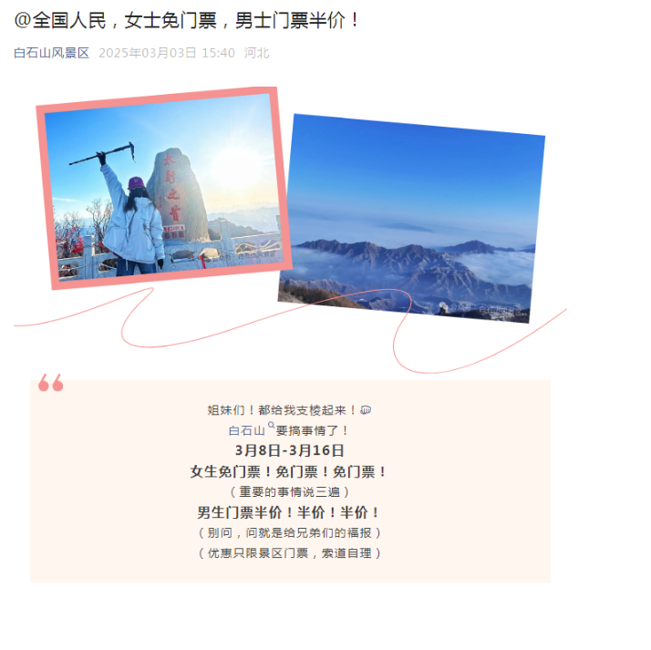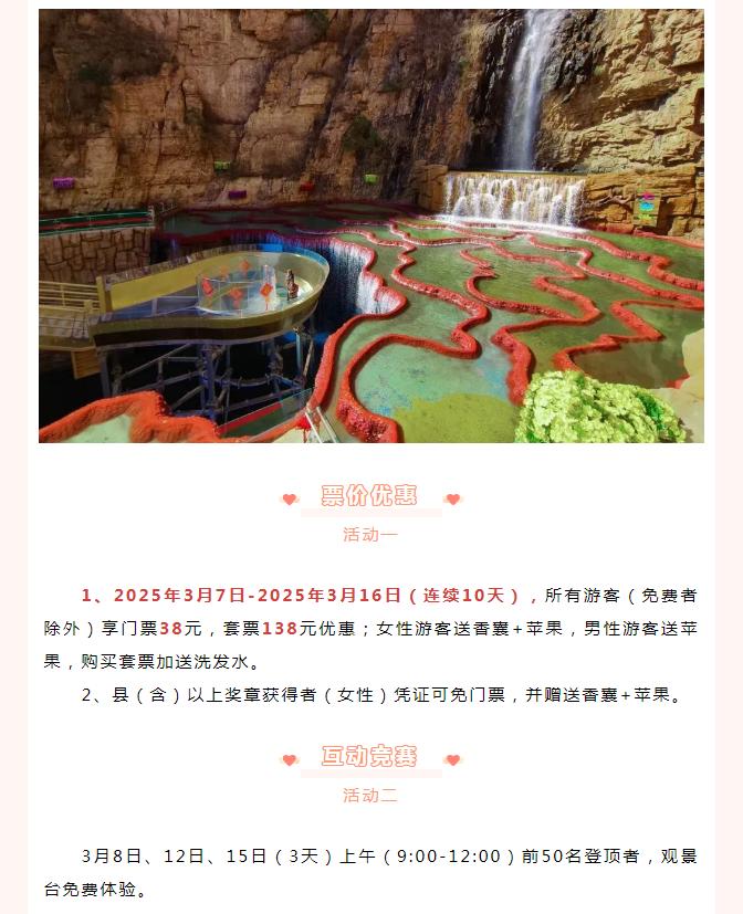 2025年3月8日-3月16日,女士免門票,男士門票半價(優(yōu)惠只限景區(qū)門票)