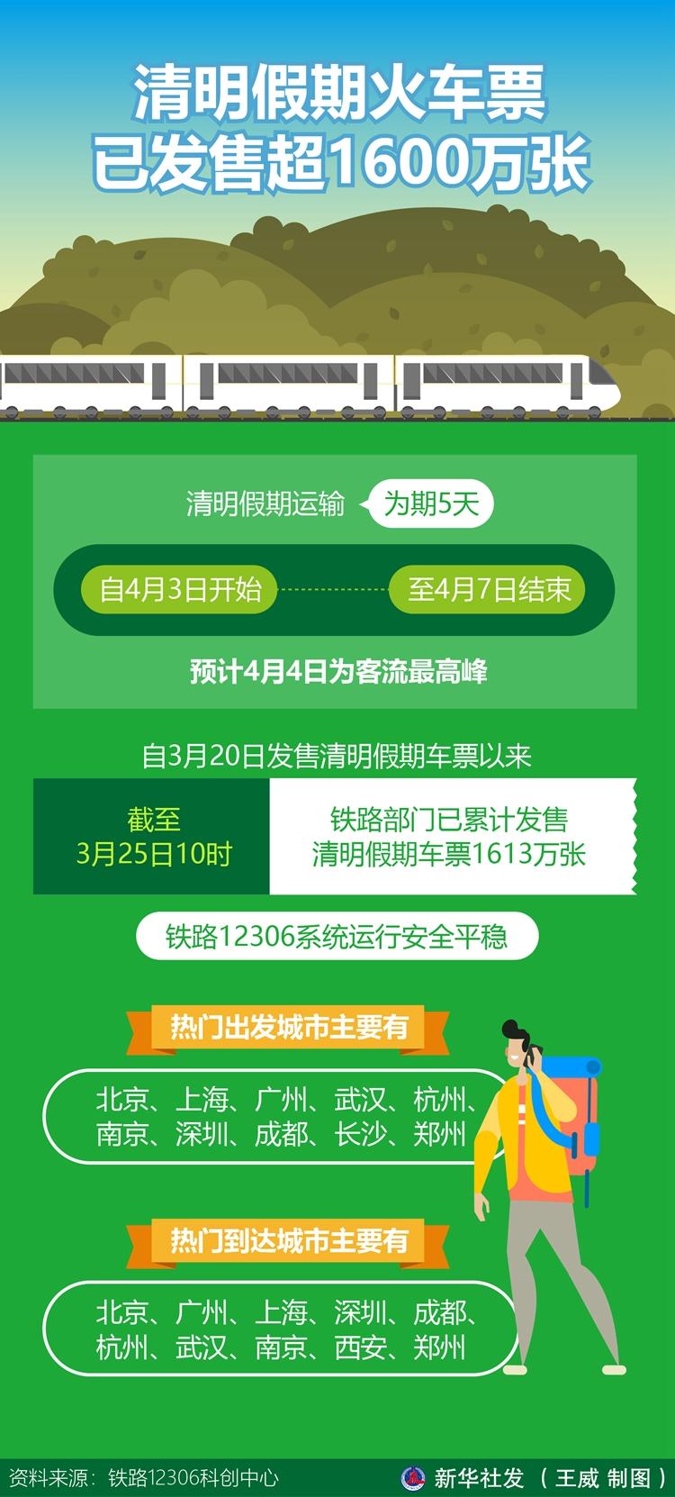 記者25日從鐵路12306科創(chuàng)中心獲悉,清明假期運輸自4月3日開始,至4月7日結束,為期5天,預計4月4日為客流最高峰。自3月20日發(fā)售清明假期車票以來,截至3月25日10時,鐵路部門已累計發(fā)售清明假期車票1613萬張,鐵路12306系統(tǒng)運行安全平穩(wěn)。