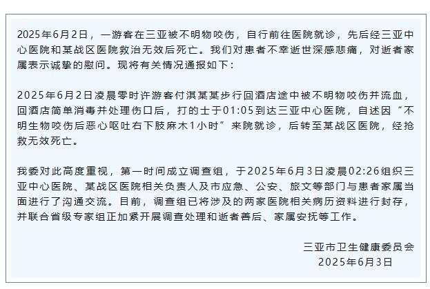 2025年6月2日凌晨零時許游客付淇某某步行回酒店途中被不明物咬傷并流血,回酒店簡單消毒并處理傷口后,打的士于01:05到達(dá)三亞中心醫(yī)院,自述因“不明生物咬傷后惡心嘔吐右下肢麻木1小時”來院就診,后轉(zhuǎn)至某戰(zhàn)區(qū)醫(yī)院,經(jīng)搶救無效死亡。