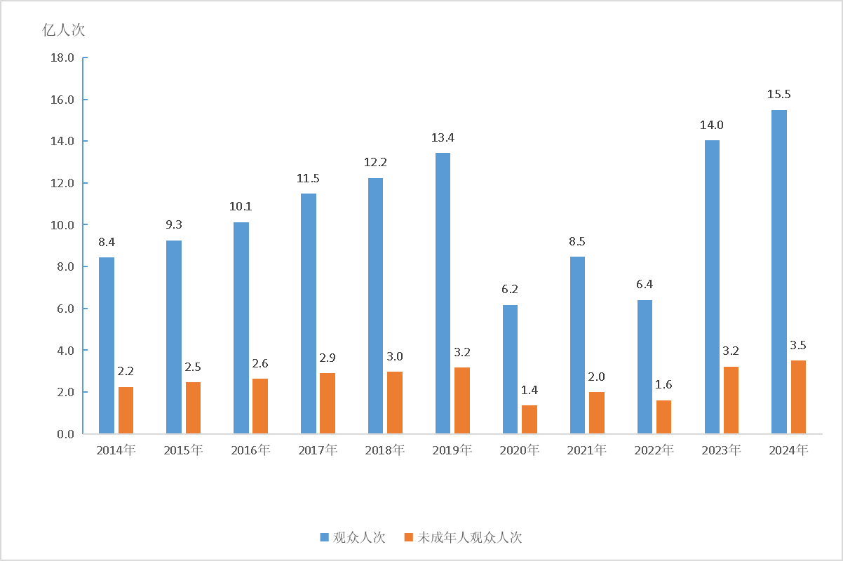 圖4:2014—2024年全國文物機構(gòu)接待觀眾人次及未成年人觀眾人次