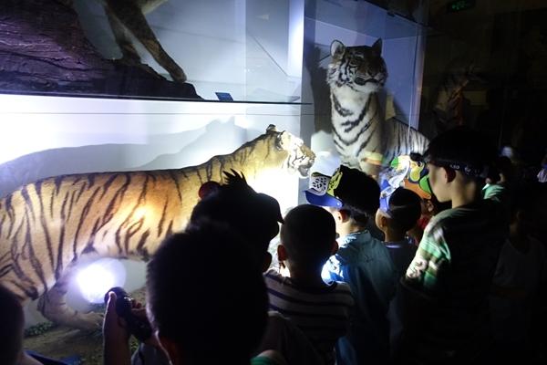 孩子們在國家動物博物館熄燈環(huán)境里用手電筒照明,觀察孟加拉虎和東北虎標本。受訪者供圖