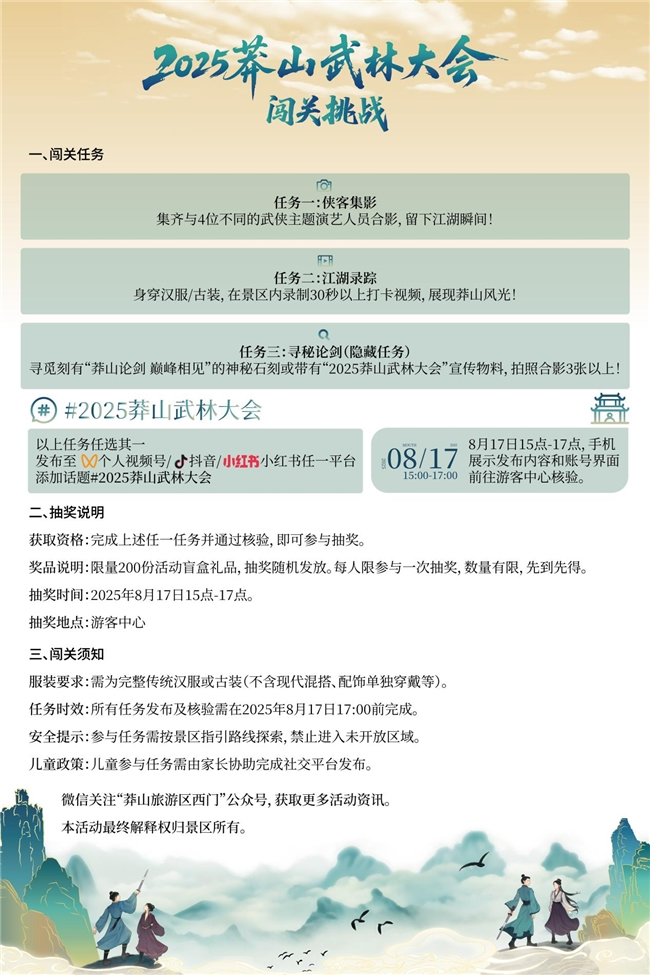 以上關(guān)卡任務(wù)任選其一,發(fā)布至個人視頻號/抖音/小紅書任一平臺,添加話題#2025莽山武林大會,經(jīng)核驗后即可抽取限定盲盒!