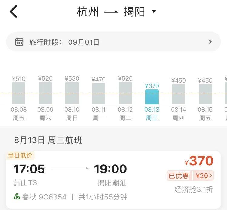 8月中旬,寧波飛廣州、揭陽的機(jī)票價格2字頭就可拿下,比如8月13日寧波飛廣州最低票價僅需279元(不含稅),8月12日寧波直飛揭陽機(jī)票價格最低僅需290元(不含稅)。