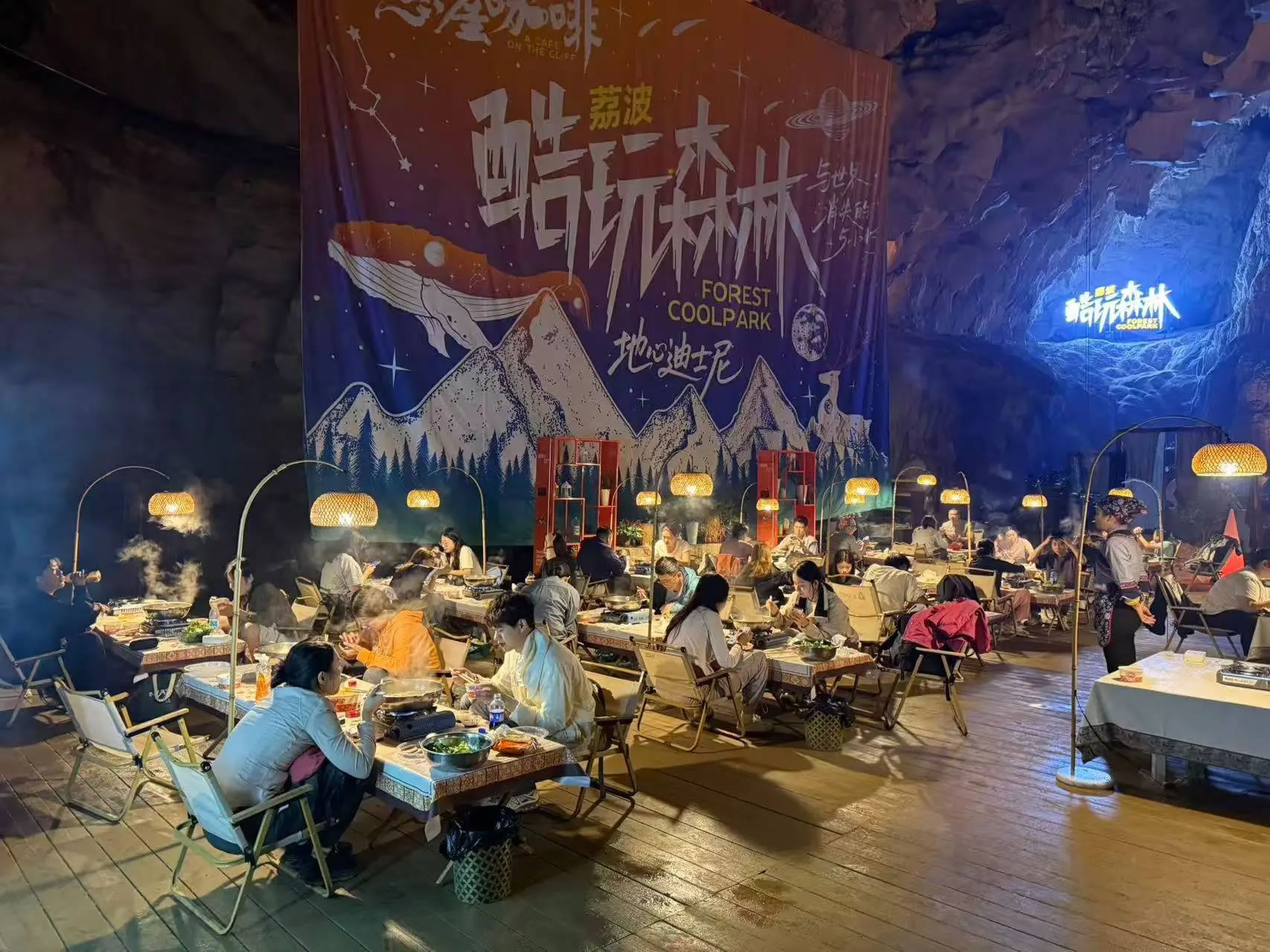 探險之后,在常年保持15攝氏度的洞穴餐廳,吃上一頓熱氣騰騰的火鍋,感受與洞外溫差帶來的獨特體感,成為游客們的特別享受。開闊的洞廳內,數(shù)十張餐桌整齊排列,餐桌上方的暖色照明燈既保證了用餐所需的足夠亮度,又完整保留了洞穴的自然氛圍。游客們一邊圍坐火鍋旁大快朵頤,一邊欣賞巖壁上自然形成的奇異紋路,感受這個地下空間獨有的神秘。