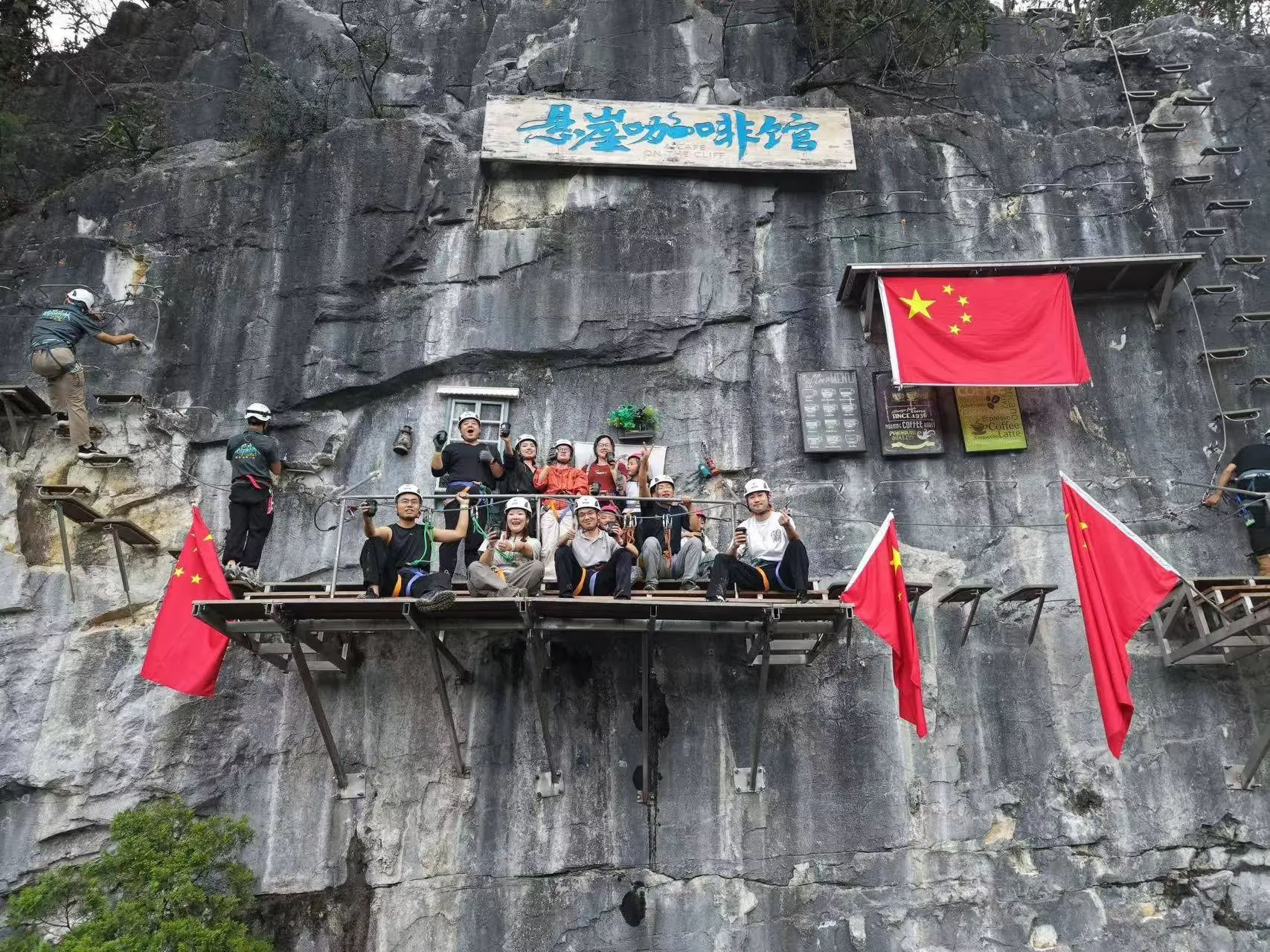 在距離地面200米的崖壁上喝上一杯咖啡,也是酷玩森林最受歡迎的項目之一。游客佩戴專業(yè)登山裝備,在教練陪同下沿固定路線攀登至懸崖中段的休息平臺。站在平臺上,山川云海盡收眼底,隨手拍都是 “朋友圈大片”,刺激又出片。