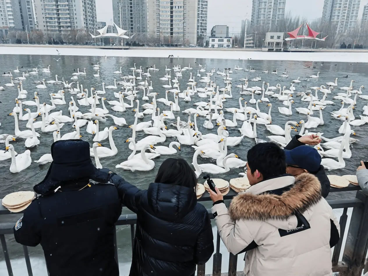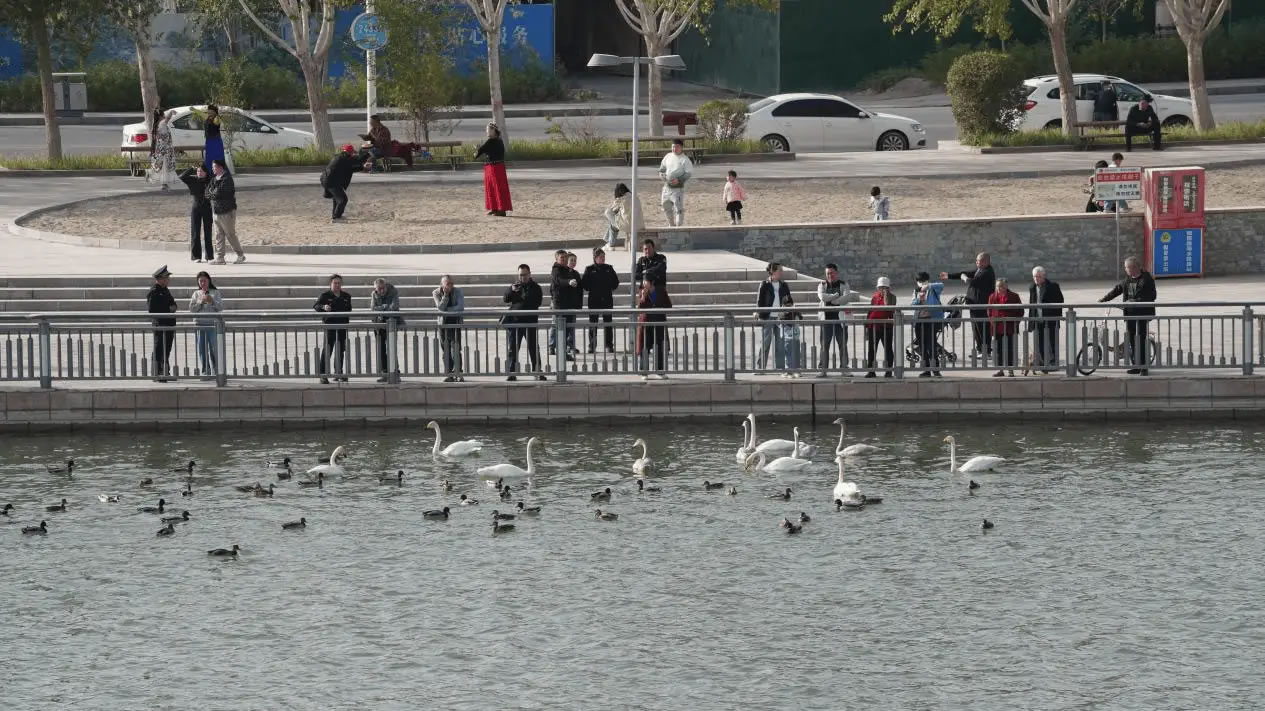 而天鵝們“鐘情”于庫(kù)爾勒白皮馕的趣味習(xí)性,更是拉近了人與鳥(niǎo)的距離。每當(dāng)天鵝護(hù)衛(wèi)隊(duì)員的哨聲響起,天鵝便會(huì)從四面八方聚攏而來(lái),市民游客投喂的馕塊與天鵝歡快的鳴叫聲交織成一曲和諧的城市樂(lè)章。這溫馨的日常,是庫(kù)爾勒人文溫度與生態(tài)文明深度內(nèi)化的生動(dòng)體現(xiàn)。