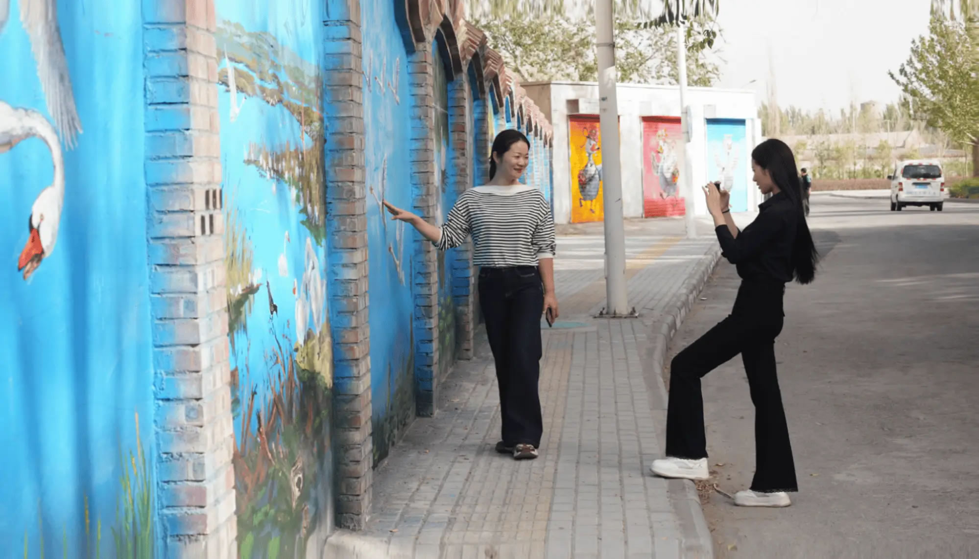 市民在天鵝墻繪拍照打卡 (黃萬(wàn)里 攝)