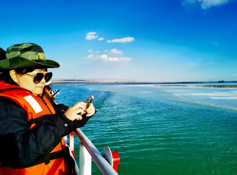 10月14日,由中共海西州委宣傳部主辦、西海都市報(bào)社承辦的“紅杞風(fēng)光別樣美 ”活動,走進(jìn)海西蒙古族藏族自治州烏蘭縣,研學(xué)團(tuán)隊(duì)來到茶卡鹽湖,乘坐游船觀光,湖面上駛來的大型運(yùn)鹽船讓外省記者及學(xué)生不由感嘆:沒想到“天空之鏡”還有另外一種獨(dú)特景致。湖面上駛來的大型運(yùn)鹽船吸引了研學(xué)團(tuán)隊(duì)成員的目光。采鹽船正在鹵水中作業(yè),發(fā)出低沉的轟鳴,空氣中彌漫著咸潤的氣息。研學(xué)的同學(xué)通過實(shí)地觀察鹵水的蒸發(fā)、結(jié)晶過程,將課本上的地理、化學(xué)知識,與這片壯麗的現(xiàn)實(shí)場景融會貫通。
