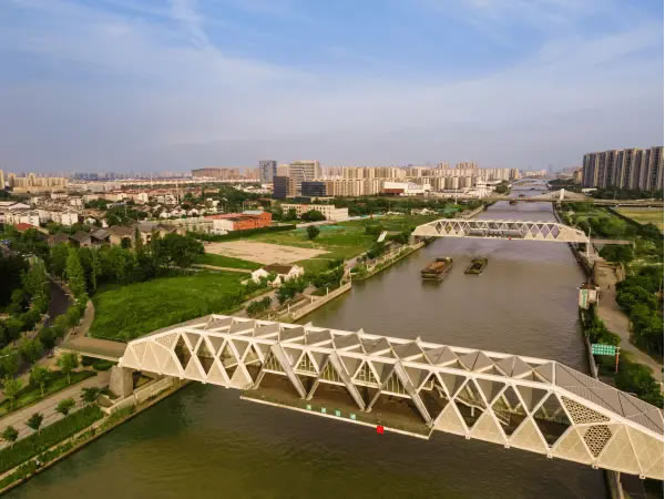 在滸墅關,順應民生所需,以文脈傳承、文化賦能滿足人民群眾對美好生活的向往,“紅房子”并非個例。就在距“紅房子”咫尺之遙的大運河上,造型別具一格的滸關南橋、北橋吸人眼球。橋身,大量運用三角形與菱形元素,充分彰顯現(xiàn)代結構美學;橋中,幾座“尖頂閣樓”突起,是特意營造的觀水場所;橋下,運河汩汩流淌,一艘艘貨輪推開波紋向前駛去。