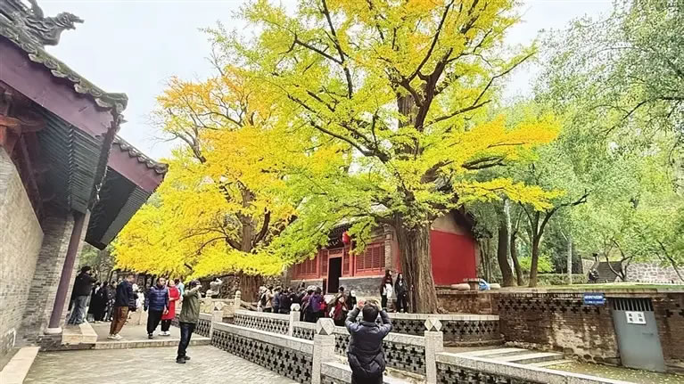 據(jù)工作人員介紹,這兩株枝干相依的古銀杏不僅是“資深網(wǎng)紅”,更是承載歷史的“活文物”。它們歷經(jīng)500年風(fēng)雨,至今枝繁葉茂,每年深秋都會(huì)如期換上“黃金盛裝”,與圣母殿、魚(yú)沼飛梁等著名古建筑共同構(gòu)成一幅動(dòng)人的秋日畫(huà)卷。
