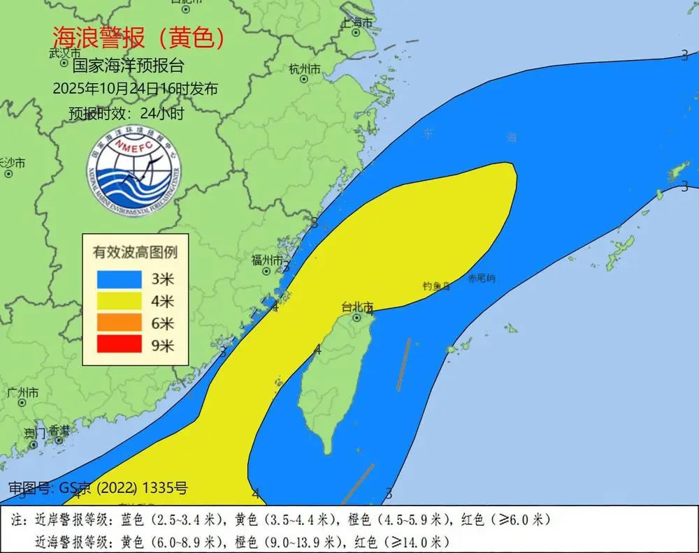 受強冷空氣的影響,預(yù)計10月24日下午到25日下午,東海南部、臺灣海峽將出現(xiàn)3米到5米的大浪到巨浪;福建近岸海域?qū)⒊霈F(xiàn)2.5米到3.8米的大浪,該近岸海域海浪預(yù)警級別為黃色,浙江南部近岸海域?qū)⒊霈F(xiàn)2米到3米的中浪到大浪,該近岸海域海浪預(yù)警級別為藍(lán)色。