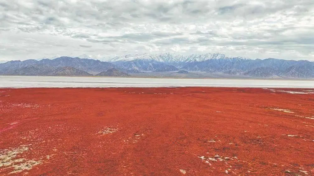 入秋后,海西蒙古族藏族自治州烏蘭縣的都蘭湖國(guó)家濕地公園,連片的鹽生植物鹽爪爪迎來(lái)最佳觀(guān)賞期。從高空俯瞰,宛如巨大的紅地毯鋪在都蘭湖畔,美不勝收,甚為壯觀(guān)。