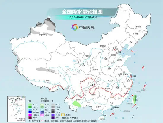 昨天開始,全國的降水開始逐漸減少。昨天,東北地區(qū)的降雪基本結(jié)束,南方仍有大范圍陰雨。監(jiān)測顯示,24日8時至25日6時,新疆北部、內(nèi)蒙古東部、東北地區(qū)及山東半島等地部分地區(qū)出現(xiàn)雨夾雪或小雪;廣西北部至浙江北部一帶等地部分地區(qū)出現(xiàn)中雨或大雨。