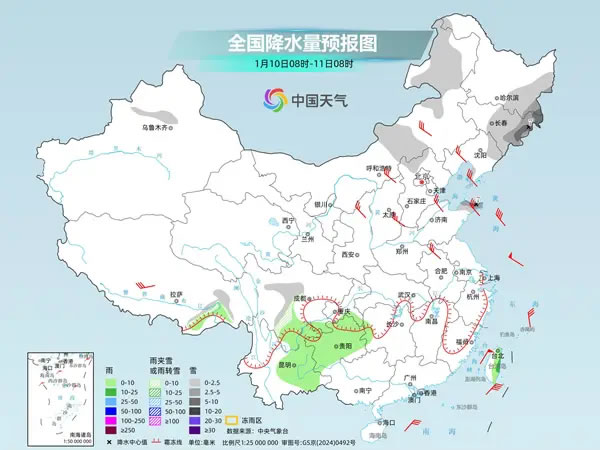 這次冷空氣南下過程中,帶來的雨雪天氣并不多,主要在內蒙古中東部、東北一帶。監(jiān)測顯示,9日8時至10日6時,內蒙古中東部、遼寧、吉林、黑龍江東部、河北北部、山西北部等地出現(xiàn)小到中雪或雨夾雪,內蒙古東南部、遼寧中東部、吉林東南部部分地區(qū)現(xiàn)大到暴雪。