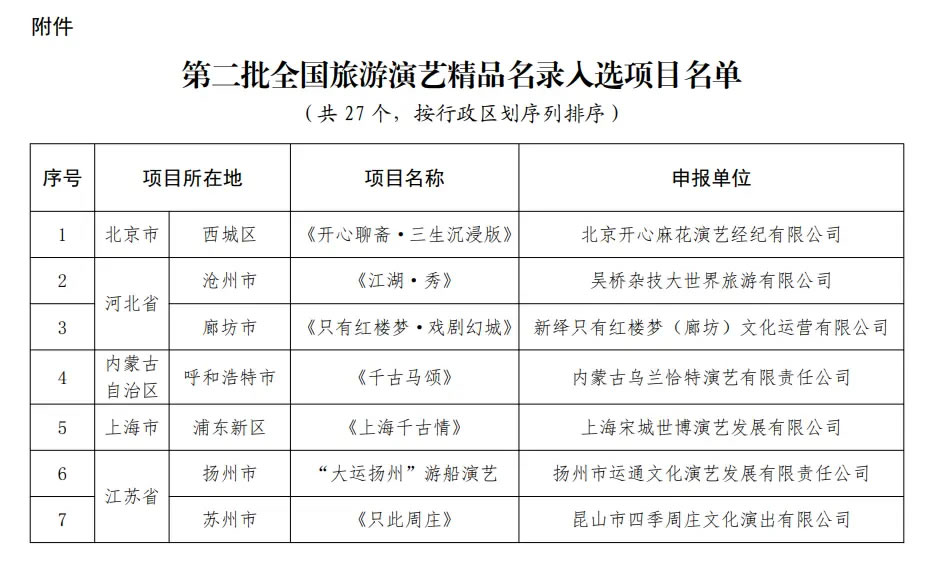 央廣網(wǎng)北京1月16日消息(記者 宋雪)文化和旅游部辦公廳近日發(fā)布通知,公布第二批全國旅游演藝精品名錄入選項(xiàng)目名單,《只有紅樓夢·戲劇幻城》《赳赳大秦》《樂動(dòng)敦煌》等27個(gè)項(xiàng)目入選。