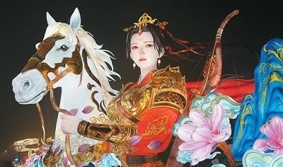 敘事主題的豐富,讓彩燈成為講述中國故事的載體。180米長的《木蘭傳奇》燈組步道上,花木蘭的颯爽英姿與家國大義徐徐鋪展,傳統(tǒng)人物的精神內核在現代光影技藝演繹下直抵人心。抬眼望去,全長210米、高達32米的鯤鵬燈組震撼全場,“鯤鵬展翅”的視覺奇觀與當代載人航天、深潛等場景光影交融。福祿廣場,藻井如蓮花般旋轉,光影“福”字“從天而降”落入游客掌心,讓“伸手接福”從“吉祥話”變成可觸碰的溫暖記憶。
