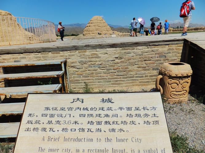 月城北側(cè)為內(nèi)城,四面環(huán)繞的補墻多已坍塌,從遺址上看近似方形,南北長190米,東西寬180米,神墻正中各有神門,南神門址高出地面半米多,寬12米,門址兩側(cè)神墻比其他地方的更寬,周圍散落著大量建筑材料,其它各門址周圍亦散見磚瓦等建筑用材。各轉(zhuǎn)角處略顯高大,可能原來建有角樓。南神門內(nèi)中軸線40米偏西約8米處有一處獻殿遺址,已清理,臺基為東西長方形,長20.2米,寬15.2米,高70厘米,臺基邊緣向上略有收分,上部為黃沙土夯筑,下部為黃沙土層與砂石層相間夯筑,南部有踏道,斜長3.5米,寬3米,臺基踏道兩側(cè),各有一列基址.地面有石像生殘塊,基址南北向,南北長10米,東西寬2.8米,兩縱側(cè)砌有長方形磚。獻殿清理出的堆積物主要有:長方磚、方形磚和板瓦、筒瓦、灰槽瓦及瓦當、滴水等遺物殘塊,以筒瓦最多。距獻殿約5米處為墓道封土,呈東南-西北走向,但方向擺動不大。寬6至10米,西北端高大,整個墓道封土高度介于0.5至2米之間,形似魚脊,主要為砂石土。北端靠近陵臺有一半圓形盜坑,直徑約6米,深約5米,破壞了陵臺南部底邊。內(nèi)城西北處有一陵臺,四面坍塌嚴重,殘高約為10米,黃土夯筑,各層夯土之間夾有幾層石塊,椽洞分布不勻,夯層的厚度在8至13厘米不等。西側(cè)清理的堆積中有磚瓦等建筑用材。從盜坑斷面來看,陵臺似乎是平地起建的,沒有打地基陵臺底部的外表覆蓋有紅泥皮。位于內(nèi)城墻外約5米處為外神墻遺址,墻基寬1.7米,沿墻基準礫石,最終連通至內(nèi)城南墻。外神墻到達東、西、北三神門處,皆向外凸出一個長方形空間,長17米左右,寬12米左右,空地內(nèi)地面平整,沒有其它遺跡現(xiàn)象。外神墻外有4座角臺遺址,已經(jīng)全部坍塌,北面兩座角臺基址相距340米,南面兩座角臺相距365米。東南角臺還殘存大約4.5米的部分,方形夯土臺邊長4.5米,夯土中央有石塊,周圍散落部分建筑材料,其余三座角臺殘存均不超過1.5米。