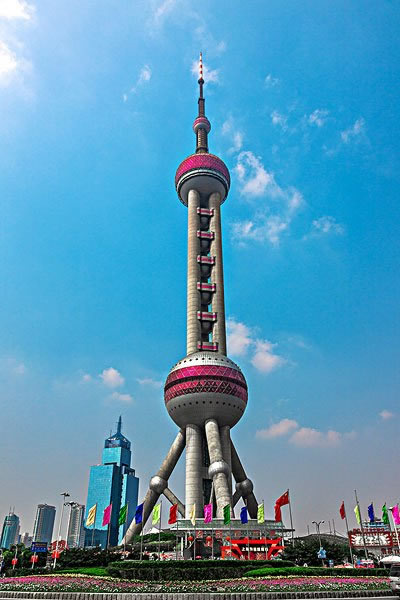 東方明珠廣播電視塔3個垂直筒體由5道橫梁加以聯(lián)結(jié),組成5個小球體,每個直徑約12米,設(shè)計為高空旅館。