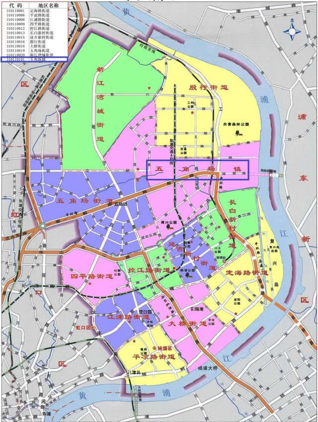 楊浦區(qū)轄12個街道:定海路街道、平?jīng)雎方值馈⒔致方值、四平路街道、控江路街道、長白新村街道、延吉新村街道、殷行街道、大橋街道、五角場街道、新江灣城街道、長海路街道