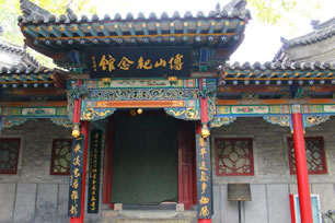 傅山紀(jì)念館,原為同樂(lè)亭,建于清乾隆二年(1737年)。傅山紀(jì)念館位于晉祠博物館內(nèi)勝瀛樓的西南側(cè),是坐南向北的一座清代建筑的四合院,其總占地面積553.5平方米,整個(gè)館址東西寬20.7米,南北深27米,館內(nèi)為20世紀(jì)五六十年代的構(gòu)形與裝飾,內(nèi)有南屋五楹,東西配房各三間,前開(kāi)屏門,別成院落。東北隅辟小門,東出別構(gòu)小院。館內(nèi)四周連通,布展靈活方便,為回廊式的展廳。其前門出廊,雕刻精致,油飾彩繪,雅致怡人。傅山紀(jì)念館已是永久性陳列展覽與收藏博山書(shū)面精品、文獻(xiàn)資料及對(duì)外文化交流、舉行各種活動(dòng)的重要場(chǎng)所。