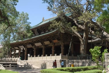 圣母殿前檐廊柱上飾有八條蜿蜒欲動(dòng)的木雕龍,是中國(guó)現(xiàn)存最早的木雕盤(pán)龍柱。其中,六條雕龍制于宋元祐二年(1087年),兩條為宋崇寧元年(1102年)増加,八條龍各抱一根大柱,怒目利爪,栩栩如生。圣母殿正面臺(tái)基兩側(cè)還有兩條無(wú)角的石雕螭首。
