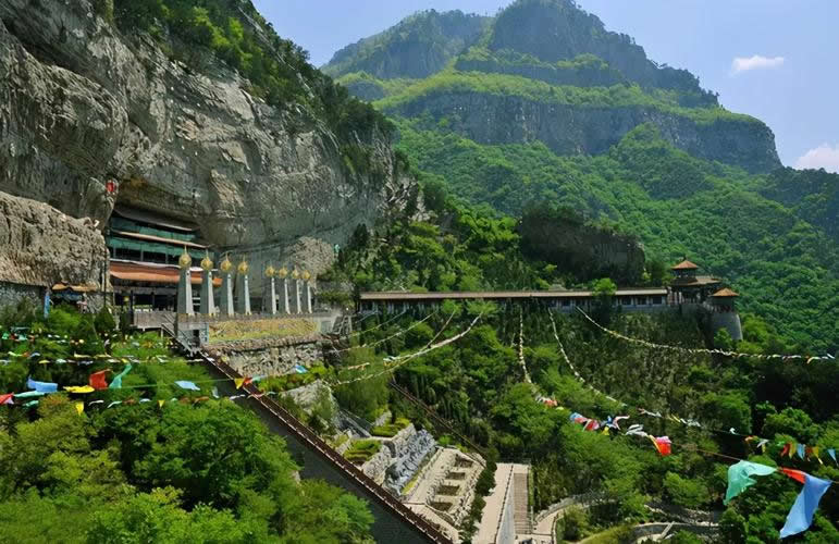 天橋是因修筑在懸崖絕壁上的棧道而得名,有千余年的歷史。長(zhǎng)300余米,寬 1 米多,上離峰頂80余米,高入云表;下距溝底300余米,懸于危巖上。每逢雨過云涌,人在橋上過,云在腳下飛,使人有平步青云,飄飄欲仙之感。景區(qū)內(nèi)主要建筑是洞神宮、祖師殿、七真殿、水母殿、懸空長(zhǎng)廊等和回頭看柏龍、兔橋、須彌石等名勝景觀。有孔明和張良等人的修行洞。此外還有中國古代最險(xiǎn)絕的軍事堡壘——石勒寨,地勢(shì)險(xiǎn)峻,易守難攻。