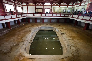 御湯遺跡:1982年4月,華清池內(nèi)基建時(shí),在今“貴妃池”西側(cè)發(fā)現(xiàn)了古建筑基址,省文管會(huì)考古隊(duì)即開(kāi)始發(fā)掘考證。用了3年多時(shí)間發(fā)掘了約4000平方米的面積,發(fā)現(xiàn)了一條長(zhǎng)18米、寬5.1米的唐代蛇形水源通道和4座青石砌成的浴池,還有大殿基址4處,發(fā)現(xiàn)30多米長(zhǎng)的石墻和兩處蓮花踏步,總長(zhǎng)400多米的陶管水道,長(zhǎng)50米的磚砌水道及建筑材料多件。1983年7月,考古工作者在溫泉總源北部發(fā)掘出一個(gè)東西長(zhǎng)10.6米,南北寬6米,深1.5米。輪廓呈蓮花瓣形的浴池遺址,池底及四周均用青石鋪砌,池內(nèi)有兩層臺(tái),池底南有兩個(gè)圓形水口。專家根據(jù)史籍記載華清宮的御池方位、形制、規(guī)模和發(fā)現(xiàn)的浴池四周的大殿基址和柱礎(chǔ)等,認(rèn)為是唐玄宗使用的九龍殿蓮花湯。1984年10月在緊挨蓮花湯西北處,發(fā)掘出一個(gè)保存完好的海棠花形狀的浴池,東西長(zhǎng)3.6米,南北寬2.9米,深1.26米,用青石砌成,池內(nèi)有二層臺(tái)階,池底正中有一圓形水口,做工考究,雕刻精細(xì),專家認(rèn)為是“海棠湯”,即唐玄宗御賜楊玉環(huán)的“貴妃池”。在蓮花湯西南還發(fā)掘出一個(gè)東西長(zhǎng)5米,南北寬2.7米,深1.2米,用青石鋪砌的長(zhǎng)方形浴池。據(jù)文獻(xiàn)記載推測(cè),應(yīng)是“太子湯”。經(jīng)考證,這些古建筑遺存與史志書記載完全吻合,是一組較完整的唐華清宮建筑遺址,也是華清宮的中樞所在,為唐玄宗和貴妃游幸時(shí)活動(dòng)的主要場(chǎng)所。期已經(jīng)全面整理,并仿唐形制,建成“唐華清宮御湯遺址博物館”供游人參觀。