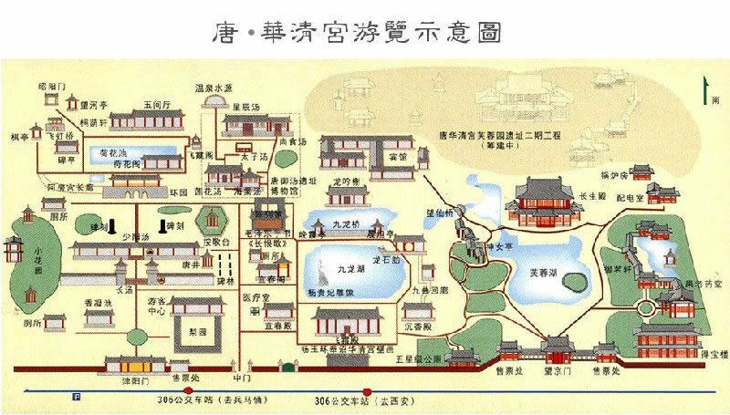 從文獻(xiàn)記載和野外的實(shí)際考察中,大抵可知華清宮的范圍是:南至驪山西繡嶺第一峰(即周烽火臺(tái)),北到今縣城北什字。東至石甕谷(寺溝)。西到鐵路療養(yǎng)院西側(cè)的牡丹溝。宮城(即羅城),南至山根,北到今縣城南什字,東至東窯村,西到游泳池。1967年新華書店在南什字西北角修建營(yíng)業(yè)樓,發(fā)現(xiàn)了用青石砌成的宮城北墻的墻基。1981年春,城建單位在西街丁字形路北,也發(fā)現(xiàn)了同樣的北墻基。1982年冬于寺溝村南的山坡上探出東繚墻兩段。從調(diào)查和發(fā)掘所見(jiàn)遺跡及文獻(xiàn)資料所記,華清宮的建筑布局嚴(yán)謹(jǐn),曲折縈回,規(guī)模宏大。唐玄宗以民脂民膏,建此豪華宮苑,供一己之歡娛,然曾幾何時(shí),“漁陽(yáng)鼙鼓”驚破了他的美夢(mèng)。華清宮樓殿湯池,遂漸次破壞,自宋以至明清,其原有建筑已蕩然無(wú)存。記其遺跡,乃以彰我民族之文化,并以此為借鑒,建立一個(gè)新時(shí)代的風(fēng)景旅游區(qū),供廣大人民群眾游覽。唐代華清宮充分利用了有利地形,使其成為一座結(jié)構(gòu)嚴(yán)謹(jǐn)、富麗堂皇的龐大宮殿建筑群。主要殿舍以溫泉為中心,構(gòu)成華清宮的核心。然后向山上和山下展開(kāi),利用地形特點(diǎn),布設(shè)不同類型和用途的樓閣亭榭,同時(shí)還有青松翠柏、荔枝園、芙蓉園、梨園、椒園、東花園等分布其間,把整個(gè)華清宮妝扮得格外妖嬈。華清宮的建筑依山面水,鱗次櫛比,除宮城(羅城)外,還有繚墻環(huán)繞?潐χ,又羅列不少建筑,清乾隆《臨潼縣志》稱:“湯井殊名,殿閣異制,園林洞壑之美,殆非人境”。