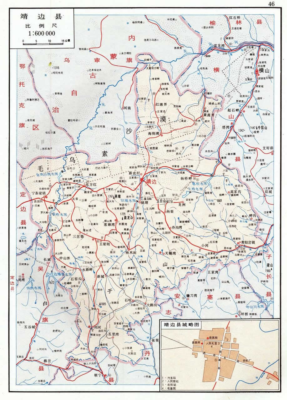 置縣初縣域無考。清乾隆年間(1736~1795),新城堡為縣城:“東與懷遠(yuǎn)縣清平堡接壤,一百二十里;西與定邊縣柳樹澗接壤,一百二十里;南與保安縣牛頭坡接壤,一百一十里;北至邊墻十里”(乾隆手抄本《靖邊縣志稿》)。光緒年間(1875~1908),鎮(zhèn)靖堡為縣城:“東至崔家畔一百里,與懷遠(yuǎn)縣之狄青原接界;西至二道渠一百一十里,與定邊縣之茶店圾接界;南至黃花池灘二百一十里,與保安縣之柳溝接界;北門外即邊墻,出口至四樸樹六十里,與懷遠(yuǎn)縣之本塔兒梁接界;東南至沈家園子八十里,與安塞縣之平橋接界;西南至闊闊川二百一十里,與定邊縣之侯家岔、甘肅省安化縣之亂石頭接界;東北至毛烏素六十里,與懷遠(yuǎn)縣之許家沙畔接界;西北至史家地坑一百一十里,與定邊縣之二十里塘接界。計(jì)東西廣二百一十里,南北袤二百七十里”(光緒本《靖邊縣志》)。