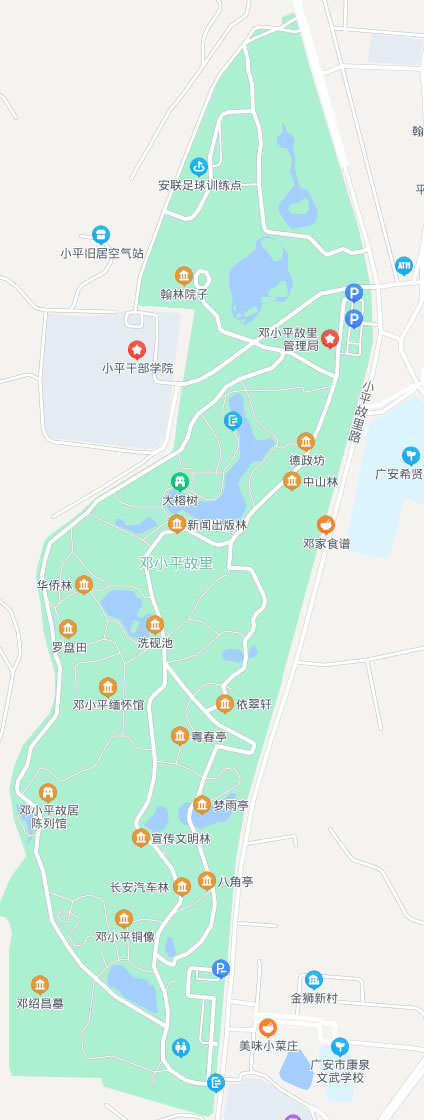 2004年8月,成立鄧小平紀(jì)念館;同年12月,更名為鄧小平故里管理局,負(fù)責(zé)管理和保護(hù)鄧小平故里紀(jì)念園區(qū)和佛手山風(fēng)景區(qū)。鄧小平故里現(xiàn)有全國(guó)重點(diǎn)文物保護(hù)單位6處,以及民俗民風(fēng)等自然景觀多處。園內(nèi)按文物維修原則修繕了鄧小平故居、蠶房院子、翰林院子、德政坊、神道碑、放牛坪、清水塘、鄧家老井、洗硯池、鄧紹昌墓等近20處鄧小平同志青少年時(shí)期的活動(dòng)場(chǎng)所。