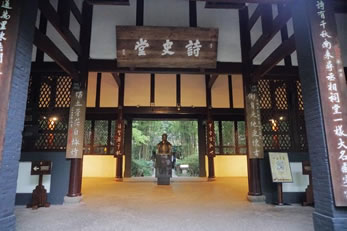 詩史堂是中軸線上的第三重建筑,也是主體建筑。杜甫留下的1400多首詩歌,真實而生動地展現(xiàn)了“安史之亂”前后唐代社會生活畫卷,反映了唐朝由盛轉(zhuǎn)衰的歷史。杜甫被后世尊為“詩圣”,他的詩歌被稱為“詩史”, “詩史堂”也因此得名。大廳的正中陳列著一尊由我國著名雕塑家劉開渠先生以寫實的手法來刻畫的杜甫塑像。