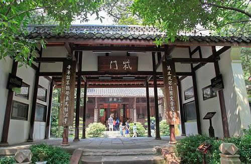 柴門是中軸線上的第四重建筑,也是最小、最簡樸的建筑。它原本是杜甫營建草堂時所造的院門。因為低矮簡陋,詩人作了如此命名。門上匾額“柴門”二字是著名畫家潘天壽所書。