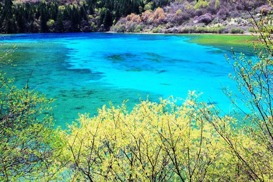 春風(fēng)吹拂,沉睡的九寨溝蘇醒了。冰雪融化,新綠發(fā)芽,春水的顏色映著山色,嬌嫩得讓人不忍探視,仿佛只要輕輕地一口氣都能讓它消失。水邊道旁,鬧哄哄開(kāi)滿(mǎn)了不知名的美麗山花,桃紅、絳紫、靚藍(lán)、鵝黃,繁華似錦,爛漫一路。溫柔而慵懶的春陽(yáng)吻接湖面,愛(ài)撫春芽,也悸動(dòng)了你久閉的心門(mén)......