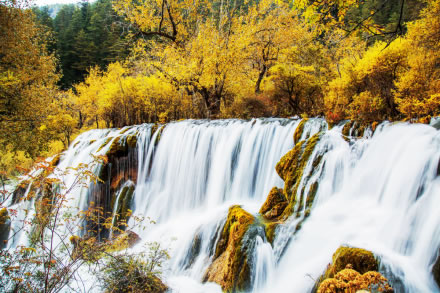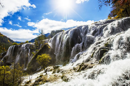 諾日朗瀑布海拔2343米,高24.5米、寬320米,是中國(guó)最寬的高山鈣華瀑布。滔滔流水自諾日朗群海而來(lái),從瀑頂樹(shù)叢中傾瀉而下,像數(shù)條潔白的哈達(dá),水勢(shì)浩大,聲震山谷。寒冬時(shí)節(jié),瀑布成了一幅巨大的冰幔,無(wú)數(shù)的冰柱懸掛在陡崖之上,成為罕見(jiàn)的冰晶世界,造型各異的冰雕迎光透著幽幽的藍(lán)色魅惑,是九寨溝六絕之一“藍(lán)冰”。